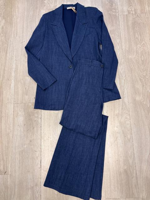 GIACCA STRUTTURATA MODELLO BLAZER CON CHIUSURA TRAMITE UNICO BOTTONE DORATO IN TESSUTO DENIM DI COTONE. ABBINA IL PANTALONE NEL MEDESIMO TESSUTO E COLORE.