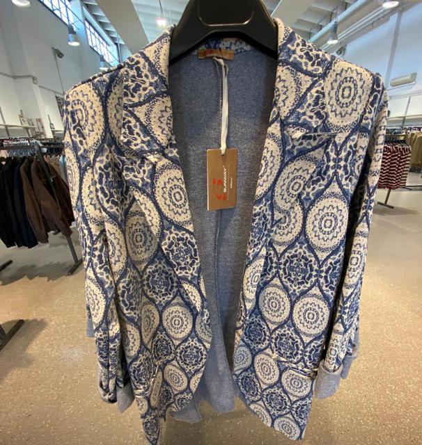 GIACCA SCIANCRATA SENZA BOTTONI IN FANTASIA GEOMETRICA SUI TONI DEL ROSA.